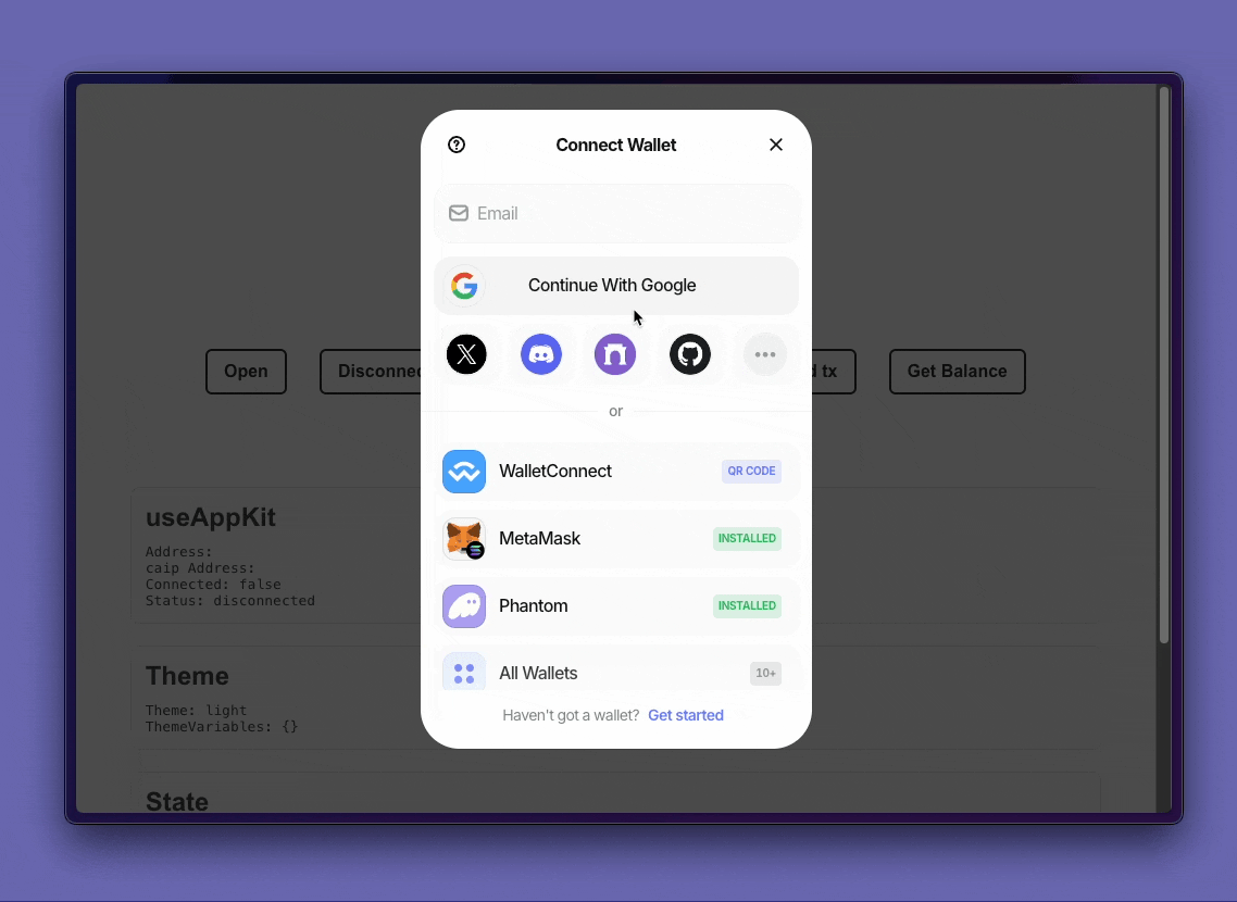 useAppKitConnectionhook from the solana Adapter, theuseAppKitAccountAppKit hook to get the account information andPublicKeyfrom the solana/web3 library.